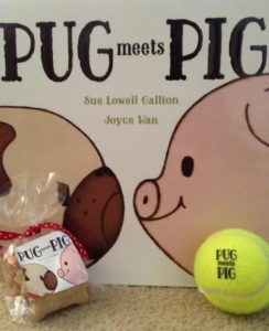 One lucky winner will receive a copy of Pug Meets Pig plus some treats for your favorite pooch (or pig!)–a goodie bag of dog biscuits and a tennis ball! (U.S. addresses; one entry per person.)