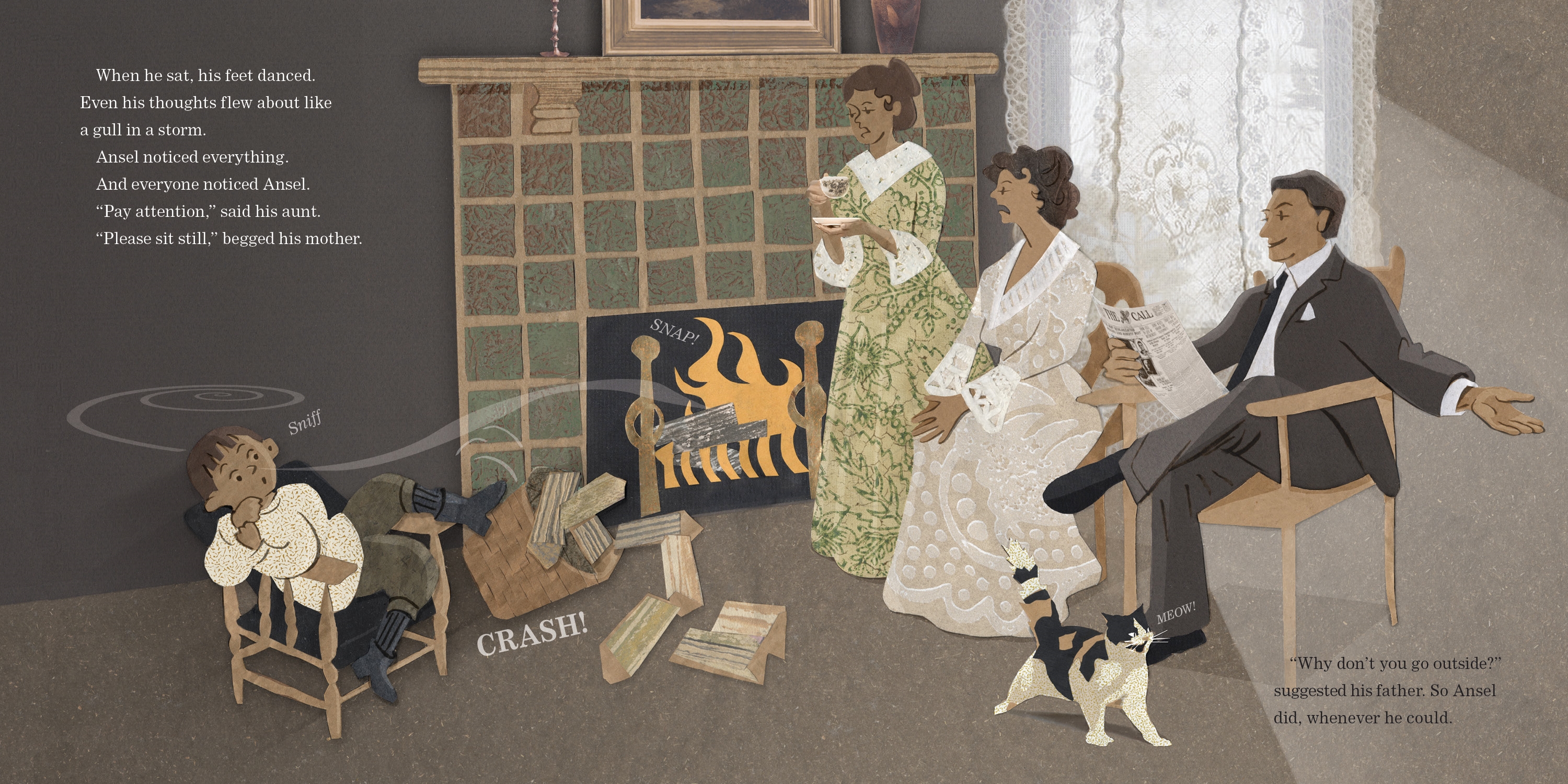 Sometimes when you deeply research a life in order to write a biography, you fall a little bit in love with your subject. Though this was my first biography, from what I understand from other biographers, that’s a common experience. I also understand that many biographers, after spending a few years with someone, fall out of love as they discover all the dimensions of a personality. That didn’t happen for me with Ansel Adams. Reading about the person, seeing where he lived and what he valued throughout his life, and particularly through reading autobiography, I felt such admiration and respect. In a well-written autobiography, you get into a state where you feel like you are experiencing a person’s essence. Reading Ansel Adams’s autobiography was like that for me — his poetic word choices, the way he described the world he lived in and his experience in that world, I had the feeling of standing beside him and seeing his world through his eyes. I wanted to carry that essence into my picture book about Ansel Adams. I wanted young readers to feel what Ansel Adams must have felt making a connection with nature in quiet Lobos Creek behind his house, or meeting his beloved Yosemite for the first time. I wanted the experience of reading Antsy Ansel: Ansel Adams, a Life in Nature, to be visceral. I hope that through my words and Christy Hale’s collage art, that people experience the world through a beautiful set of eyes.