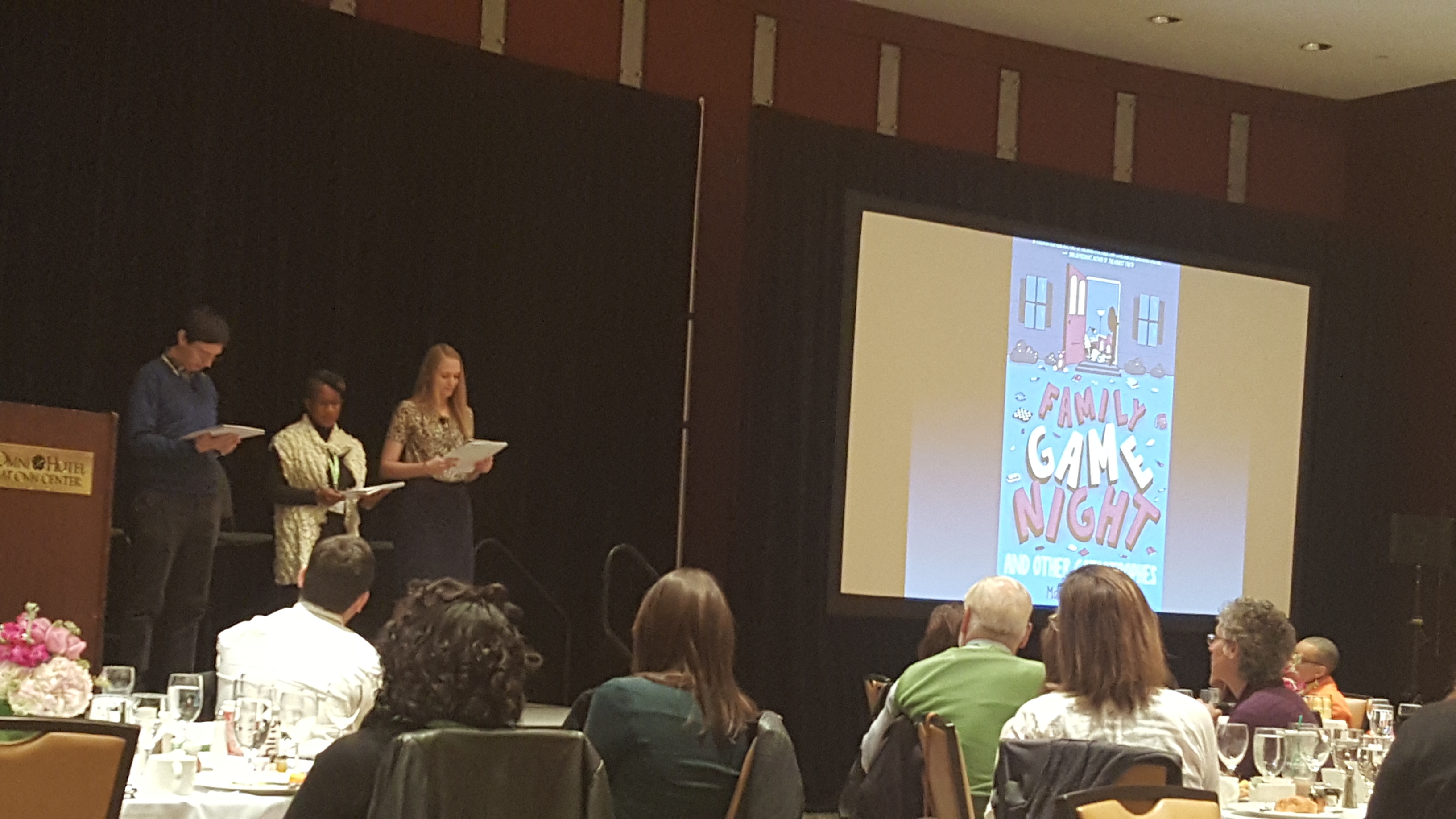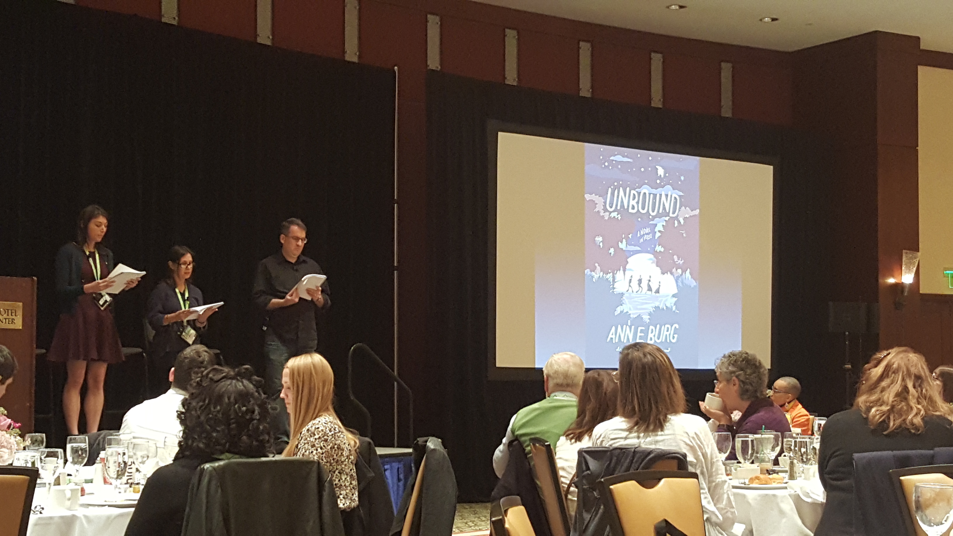 On Sunday, I attended one of my favorite events at NCTE, The Scholastic brunch, which introduces the attendees to six books and the authors, in groups of 3, take part in readers’ theater of scenes from each book. This year the authors were Ann E. Burg (Unbound), Alyson Gerber (Braced), Christine Taylor (Riding Chance), Mary E. Lambert (Family Game Night and Other Catastrophes), Peadar O’Guilin (The Call), and Jordan Sonnenblick (Falling Over Sideways).