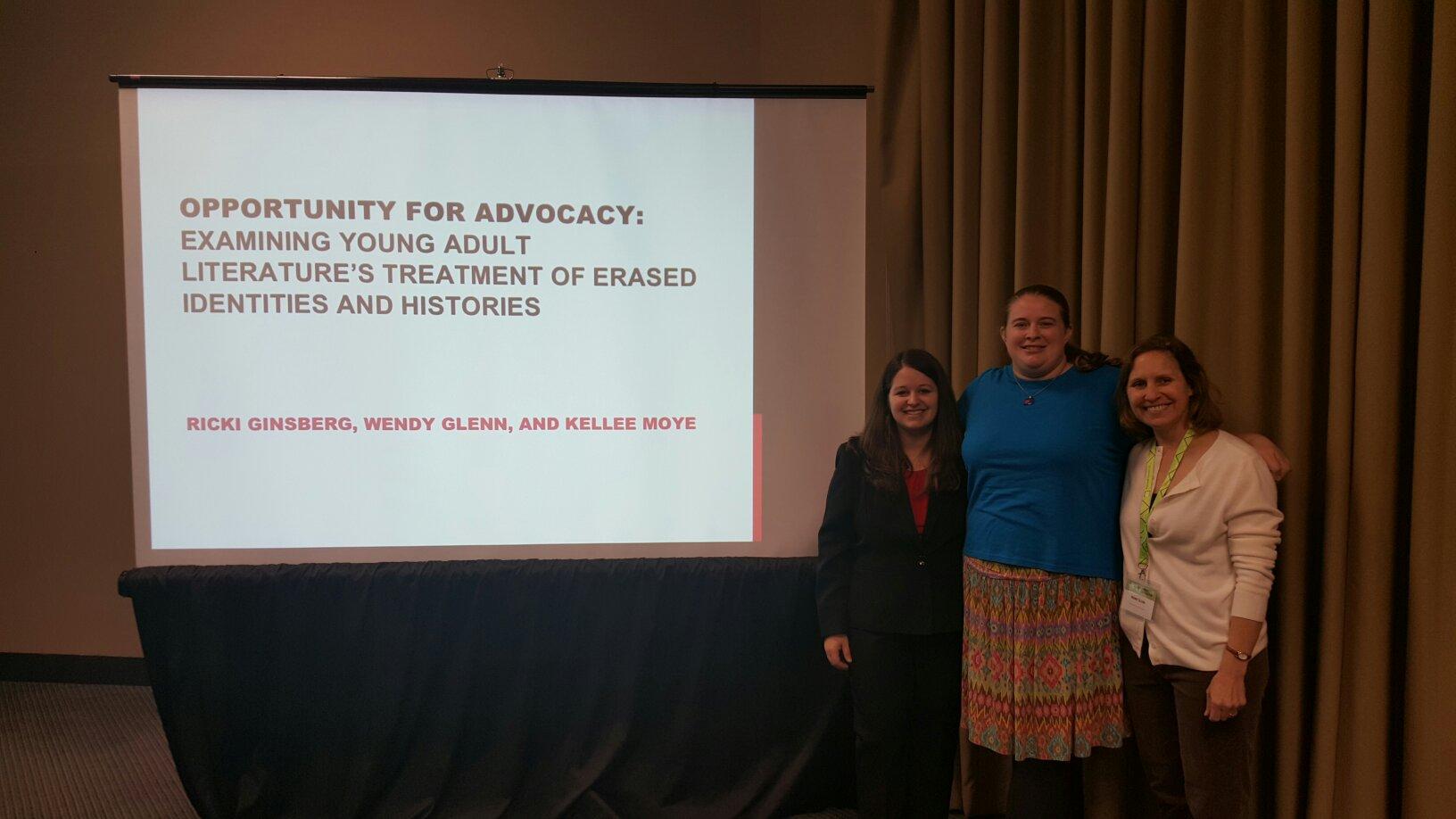 My first presentation was “Opportunity for Advocacy: Examining Young Adult Literature’s Treatment of Erased Identities and Histories.” I was really proud with how this presentation went! Wendy, Kellee, and I presented different ways that young adult texts erase or deny identities and how this can be used to promote advocacy. Two of the handouts that emerged from this session will be available this Wednesday and Thursday