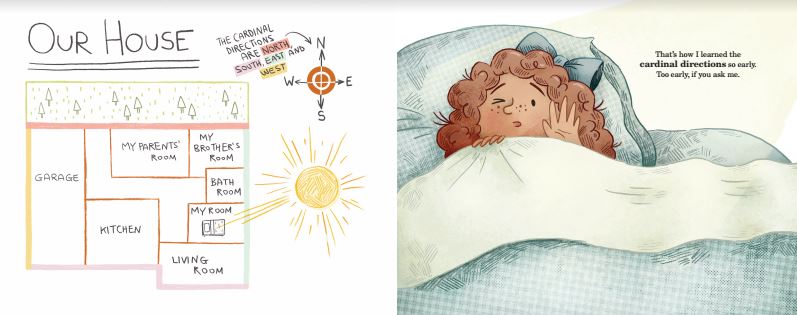 Kellee’s Review: Mapping My Day’s Flora loves maps. She thinks in cardinal directions, she maps out where everything is, and she even plays games using maps. It is because of Flora’s enthusiasm that the readers of her story are going to want to play with maps also which will *surprise, surprise* lead to them learning about mapping skills and even some mathematics. I know this book is going to find its place in elementary classrooms and so many kids out there are going to map their days out just like Flora.