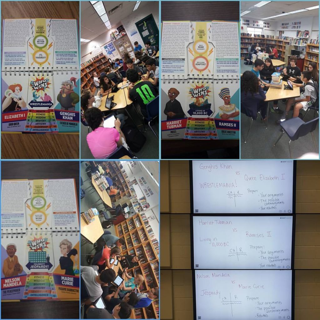 Second Debate Using Who Wins?For our second debate, I did things a little bit differently. Instead of giving them the historical person first, for each class, I randomly chose the center tile (the topic) and we ended up with: Rap Battle, Ironman World Championship, and Summiting Everest. I then let the students, within their groups, go through their side of the book to find the person they wanted for their side of the debate.