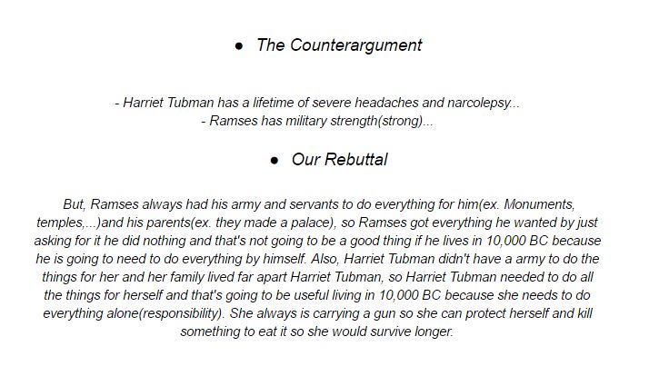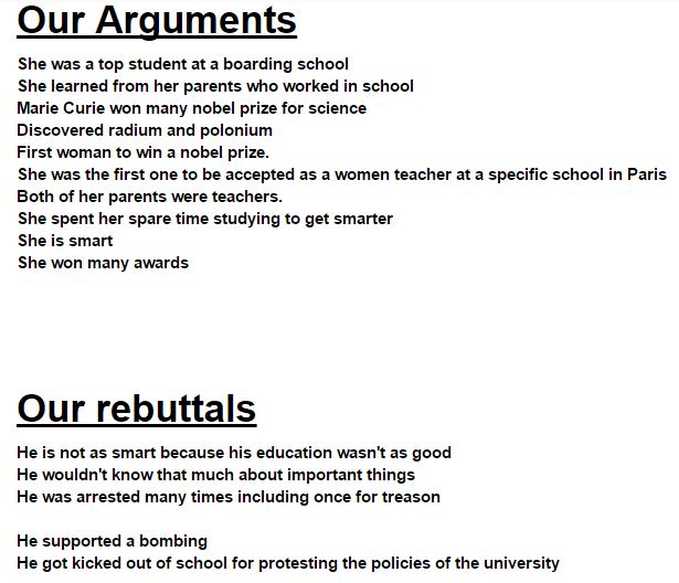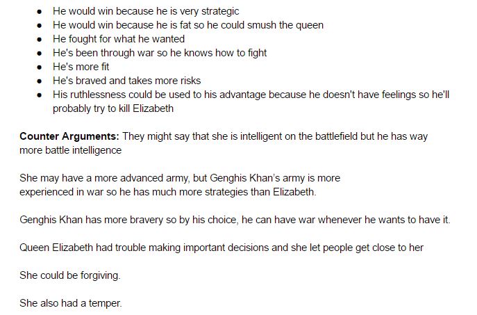 Final Assessment: As a final cumulative assessment, I asked my students to write me an argumentative paragraph stating why they felt their historical figure would be more successful than the other. Students were asked to have multiple reasons why with evidence to support their claim.