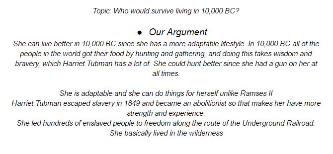 Each group then made a Google Doc that they could collaborate on, and they focuses on preparing their argument, possible counterarguments, and rebuttals to the counter argument. They could research more now that they knew the topic, and I shared Who Wins? information with them as well (see photo above).