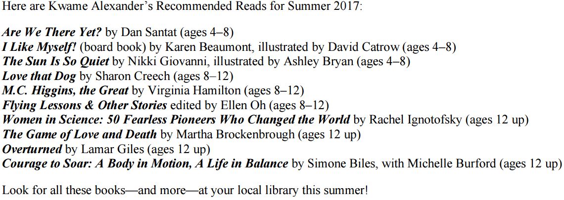 Newbery Medalist, poet, educator, and New York Times bestselling author Kwame Alexander has been named the 2017 National Summer Reading Champion for the Collaborative Summer Library Program (CSLP).