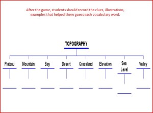 After the game, students should record the clues, illustrations, examples that helped them guess each vocabulary word.
