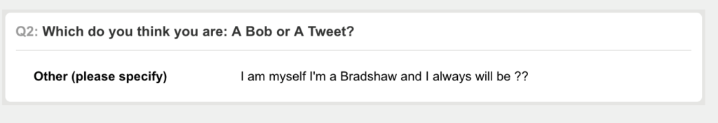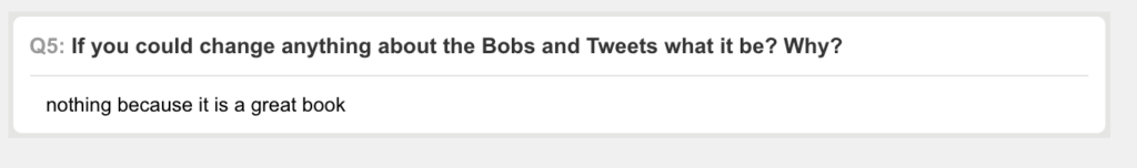 I will also ask the students to fill out a very short survey letting me know whether they are a Bob or a Tweet—and why. We have been sending out surveys about these books to kids from the beginning and the answers we get are wonderful and inspiring, and are helping to shape future books in the series.