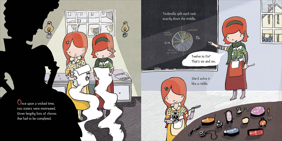 Cinderella and her lesser-known twin, Tinderella, split everything right down the middle. They each do half the housework, half the mending, and half the mean step-sister tending. When the Prince throws a ball, their fairy godmother sends them both, and they dance the night away with the prince. But he simply can’t choose between Cin and Tin, and they are in need of some clever thinking and just a pinch of magic. The Prince agrees to share his kingdom half and half, and the fairy-godmother makes him a twin too, so they can all live happily ever after. Cin and the Prince rule the kingdom, while Tin and the Twin win all the kingdom’s math competitions. It truly is a happily ever half-ter.