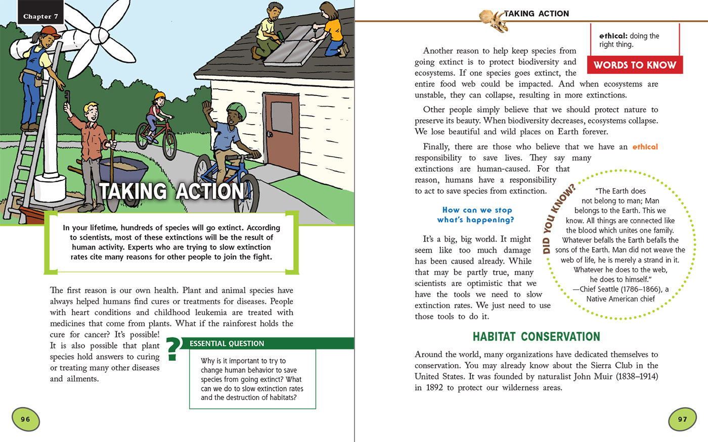 If the scientists’ predictions are right, three out of four species will go extinct over the next few hundred years. What will the world be like? Take students outside so they can get a better understanding of this prediction. Have students list the different species they observe. Encourage them turn over rocks, crawl in a garden, think about what is underground, or look in a tree. Remind them to include insects, mammals, reptiles, amphibians, birds, trees, and plants. Can they find 10? 20?