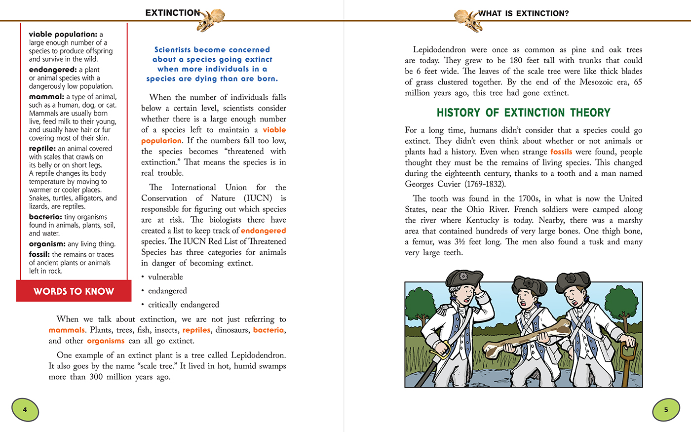 About the Book: Have you seen a dodo bird recently? Do you have mastodons playing in your back yard? Not likely—these species are extinct. In Earth’s 4.5-billion-year history, more than 5 billion species have gone extinct, some of them at the same time. In Extinction: What Happened to the Dinosaurs, Mastodons, and Dodo Birds? readers ages 9 to 12 learn about the scientific detective work scientists perform to find the culprit behind mass extinctions, including the present-day, sixth mass extinction.