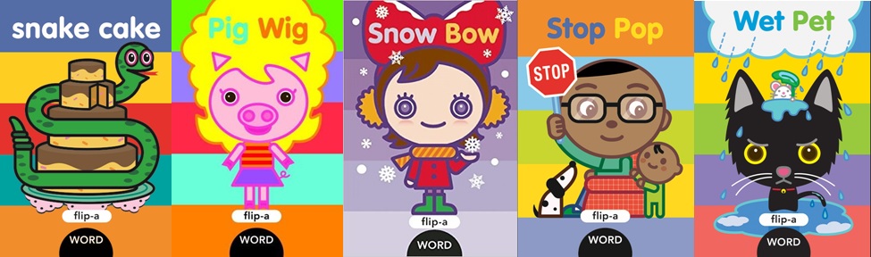 These books are really fun (for me, too!). Essentially, they work with the concept of word families. So for the first book pictured, it will introduce the sound of “ake” and then there are cut-outs on the page for both the word and the images. As the reader turns the page, the “ake” sound is repeated, and part of the picture is repeated. My son loves to flip back and forth to look at the transformation. It’s pretty ingenious and highly entertaining for both of us.