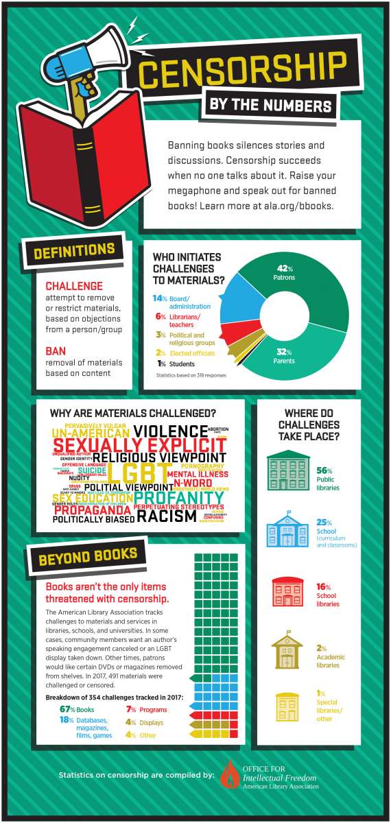 This often leads well into a question and answer period where we talk through why certain topics appear often on banned books lists. Next, I show the following infographics, which I find helpful. The first one is a bit dated, but it is beautifully done.