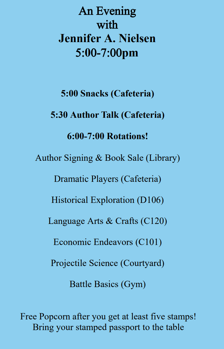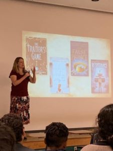 Jennifer A. Nielsen visited my school on December 4th, 2018, and today her newest book comes out (Deceiver’s Heart, Traitor’s Game #2!!!!), so I thought today would be the best day to share about the amazing experience she brought to my school and the superb person she is!