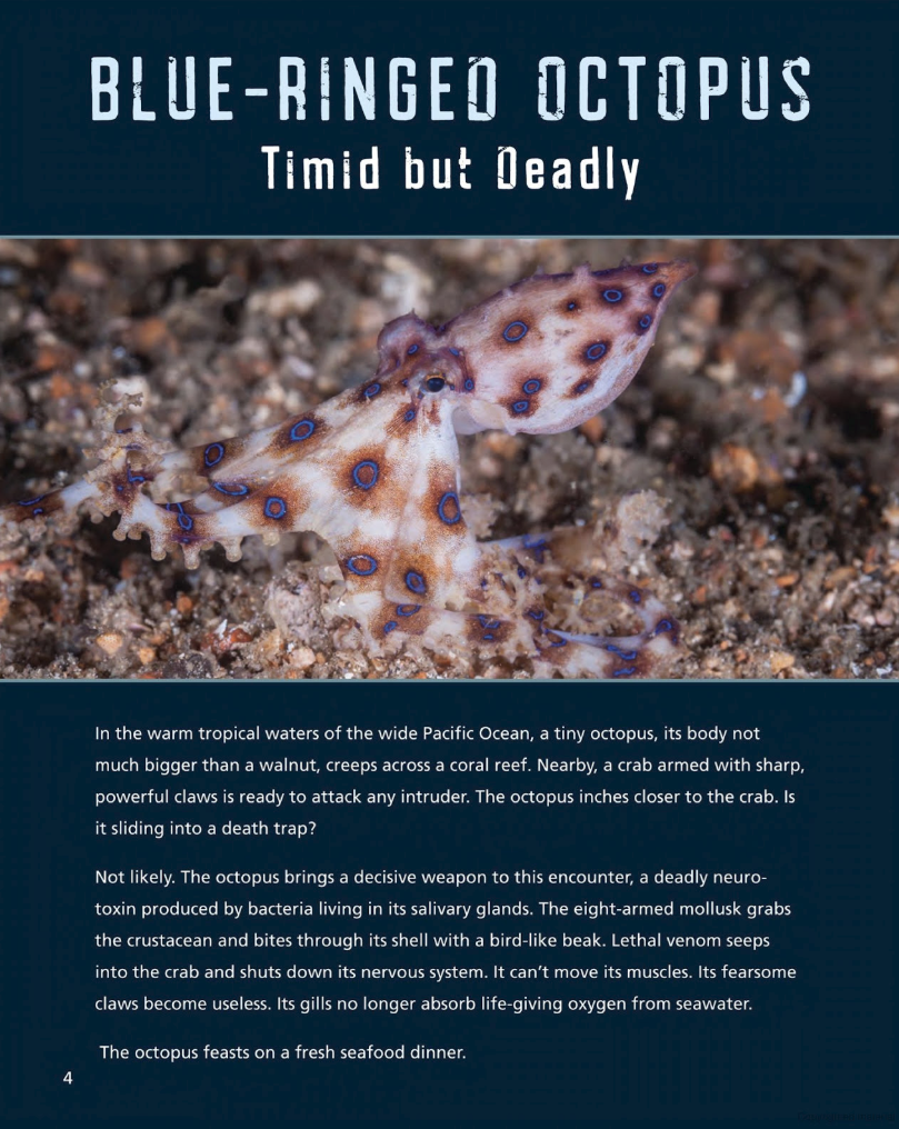 Scorpions and brown recluse spiders are fine as far as they go, but if you want daily contact with venomous creatures, the ocean is the place to be. Blue-ringed octopi, stony corals, sea jellies, stonefish, lionfish, poison-fanged blennies, stingrays, cone snails, blind remipedes, fire urchins—you can choose your poison in the ocean. Venoms are often but not always defensive weapons. The banded sea krait, an aquatic snake, wriggles into undersea caves to prey on vicious moray eels, killing them with one of the world’s most deadly neurotoxins, which it injects through fangs that resemble hypodermic needles.
