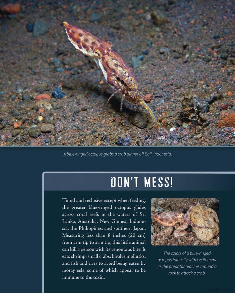 I was fascinated by so many of the facts in the book, and I loved learning about creatures I didn’t know about as well as learning more about ones I did. Check out the Flagged Passages to see how in depth the authors got which allows the reader to get a quite solid foundation about the different creatures. Additionally, the photographs are so cool because many of these creatures live where we’ll never see them.