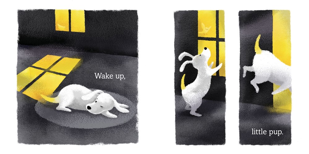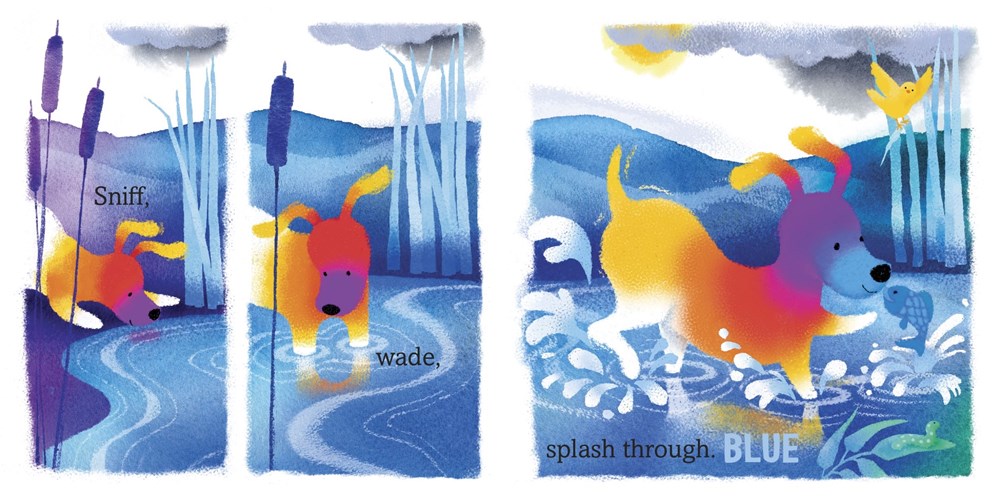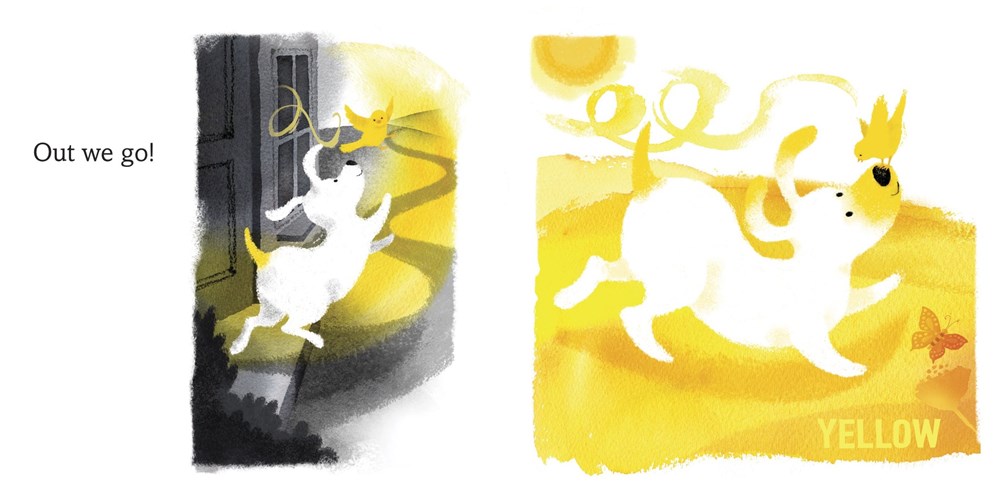 A bright yellow bird promises to bring adventure to sleepy Pup’s gray world. As Pup follows his new friend on a walk, each discovery ignites a new feeling and corresponding color, until Pup is saturated with them. But when a storm comes, Pup’s color is drained as fear sweeps through him. Only his curious yellow friend remains bright, and encourages him to keep his chin up, play, and carry on!