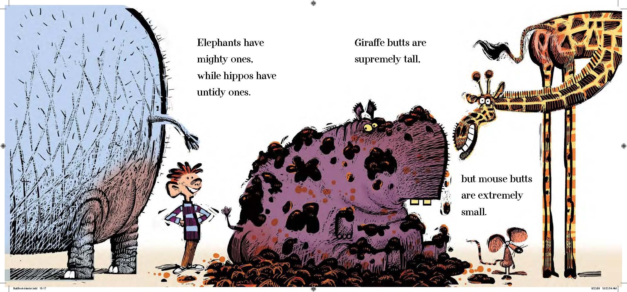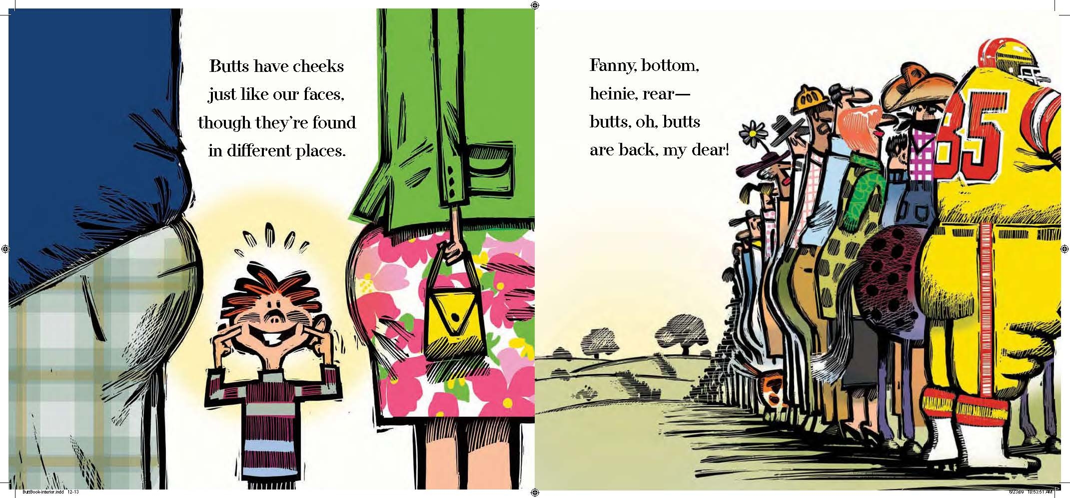 What I like to refer to as my first “mature” work, The Butt Book, which was modeled after Dr. Seuss’s The Foot Book, The Eye Book, and The Tooth Book, is a tongue-in-cheeks tribute to the posterior. It also has challenging words like “juts,” “zeal,” and the Shakespearean “perchance,” all, though, easily understood in context. Since we don’t have that many j and z words, I’m happy to introduce one of each, little words yet big ones. I recall tussling with my editor over including some possibly unfamiliar words. I dug in my heels and she eventually softened. While The Butt Book is teeming with humor, I’m most proud of the stirring finale, which culminates in this fun farewell flurry:
