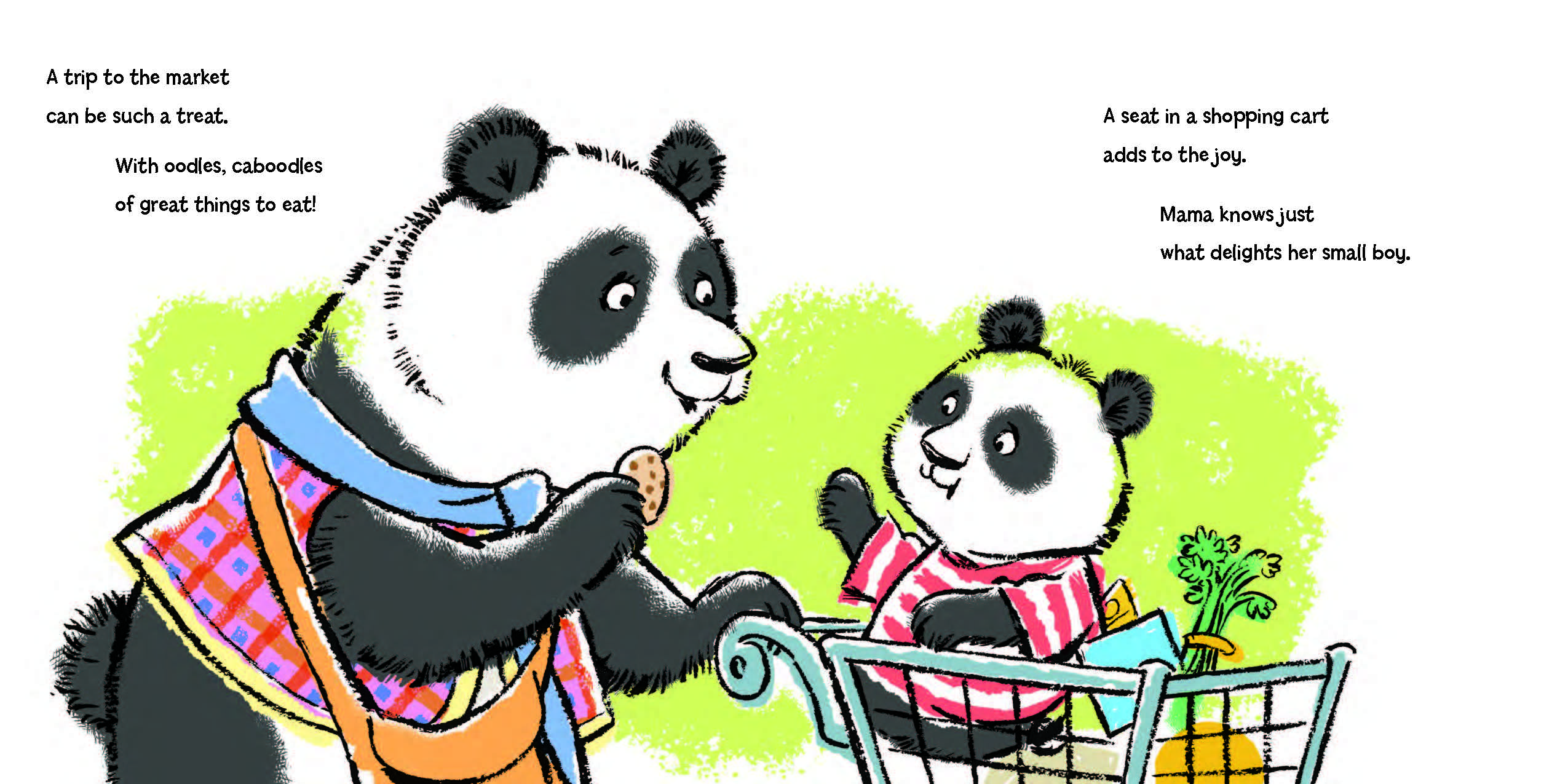 In Peter Panda Melts Down!, my first storybook, we meet a tantrum-tossing cub whose mama is struggling to avoid the mother of all meltdowns herself. I experimented with the use of a refrain, and surprise variations along the way. The refrain has an interactive element that pulls youngsters into the story. And it has some delightful, fanciful words as well. Here are a couple images:
