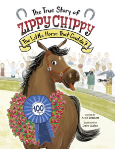 So it was only natural that I would pour my lifelong love of words and wordplay into my children’s books. I’ve made a point of introducing unfamiliar, though kid-friendly, words to young readers while also giving them a spoonful of wordplay. My brand-new children’s book, The True Story of Zippy Chippy: The Little Horse That Couldn’t, a heart-tugging, inspiring picture-book biography of a fabled racehorse, lovingly illustrated by Dave Szalay, enjoys a rich and rewarding vocabulary, with a large dollop of wordplay. Among the marvelous words you’ll find are “wafting,” “hapless,” “rambunctious,” “shenanigans,” “emblazoned,” “nuzzled,” “ballyhooed,” “heyday,” “vanquishing,” “zaniest,” and more, colorful words not often found in a picture book. These are words that are fun to say and they enrich the story of the beloved horse who ran 100 races and lost every one. And delicious, understated wordplay abounds. “Zippy bridled at the change,” “his losses continued to mount,” “to add a little horsepower,” “a running joke” are but a few examples.
