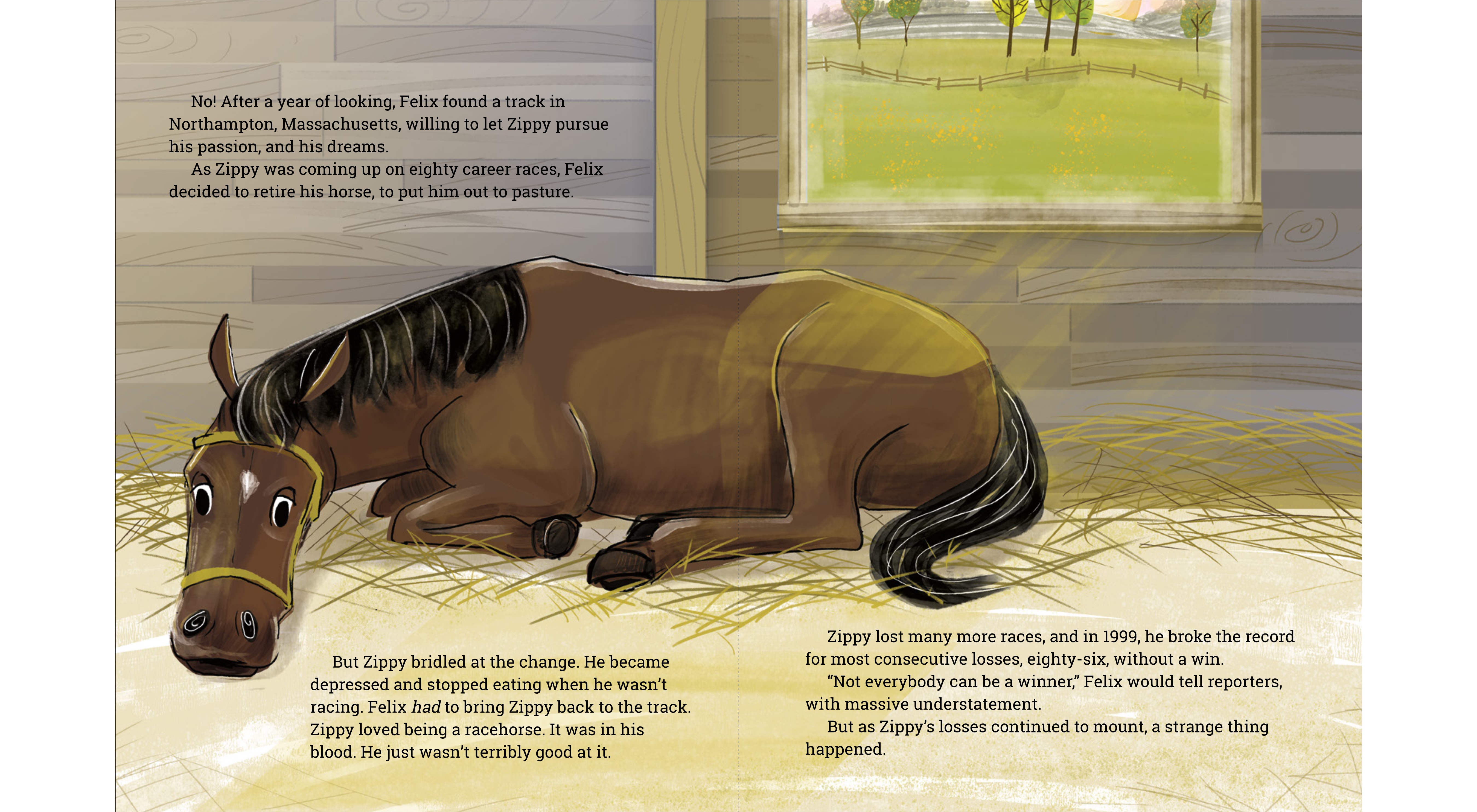 The bell rings and they’re off! Zippy the racehorse—descended from legends—is destined for glory, but when the other horses bolt from the gate . . . Zippy stands still. When people try to pet him . . . he bites their hats and escapes from his stall. What’s an owner to do? Keep on trying! After all, Zippy has become part of Felix’s family—and a close friend of his little daughter. And after 100 straight losses, Zippy shows everyone that—win, lose, or draw—it takes guts to compete and that you can lose and lose and still be a winner.