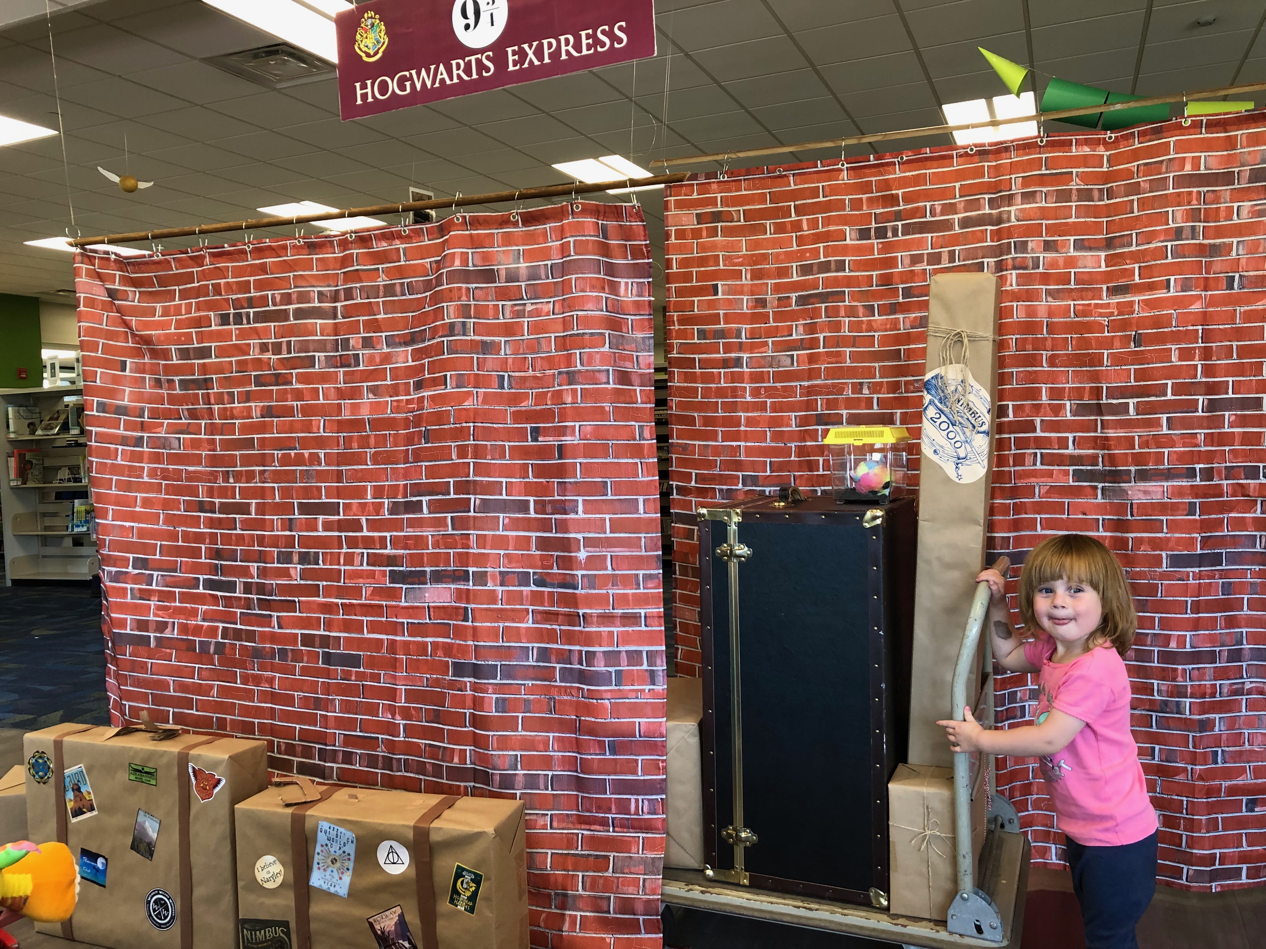 Each year, our local library celebrates the Harry Potter series with an all-day event that takes over the entire library, to include an actual Quidditch game, the Honeydukes Express food trolley, book-themed arts and crafts, a scavenger hunt, and dozens of other activities (which have expanded over the years). You can even take the Hogwarts Express via Platform 9 ¾, as my little Brooke is doing below: