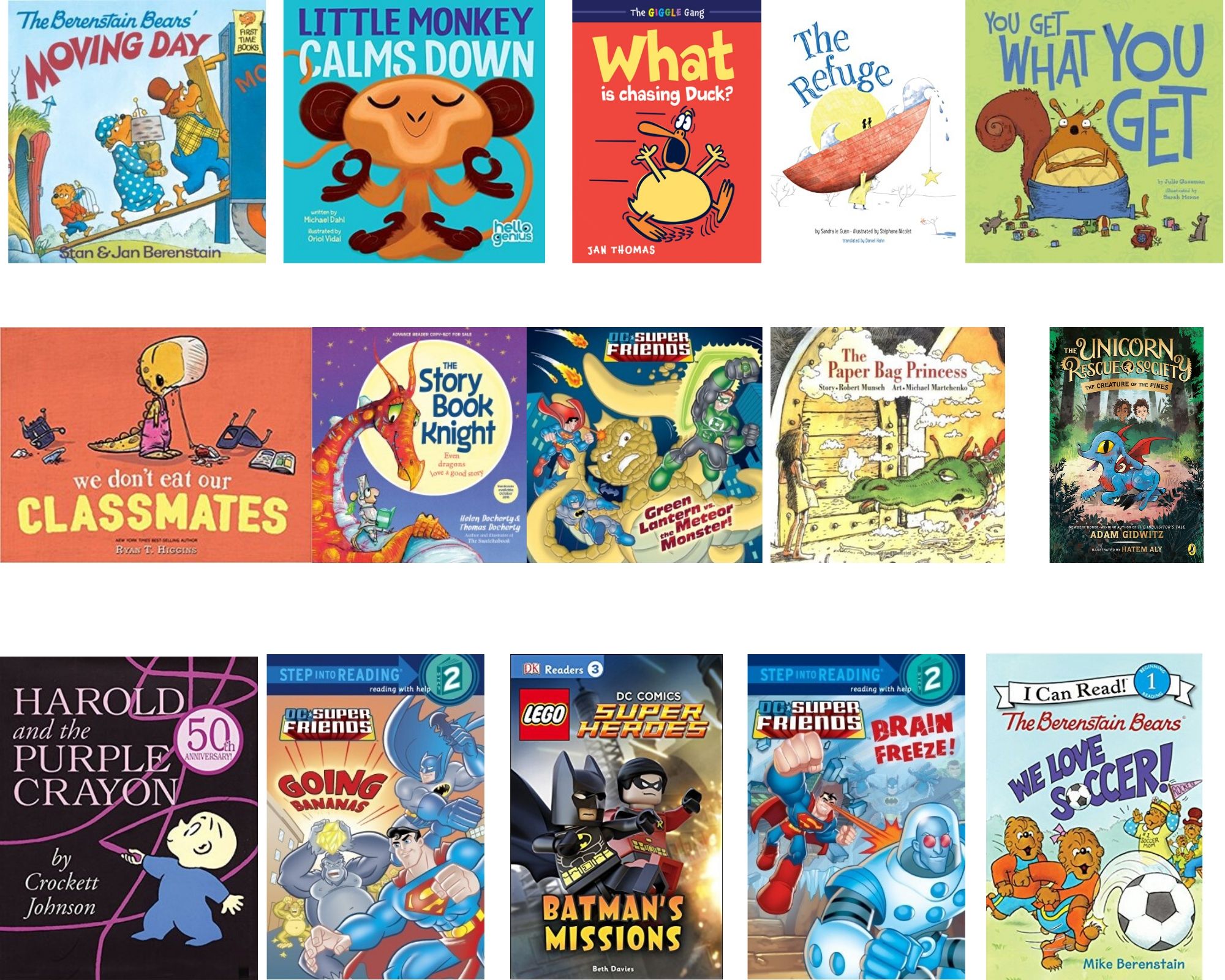 The kids have been wanting to read a lot of Berenstain Bears books lately, so I posted one above, but we’ve plowed through about a dozen of them. I’ve also grown to love the Giggle Gang series of early readers (What is Chasing Duck? is above). As long as you all will keep it a secret, I am exhausted by the DC Super Friends and Lego Super Heroes early readers. I posted four of the books we read. I honestly don’t see the appeal of freezing and superhero-ing. But my 6- and 3-year-old love them. Sigh. We’ve got several more on hold. I will pretend to love them!