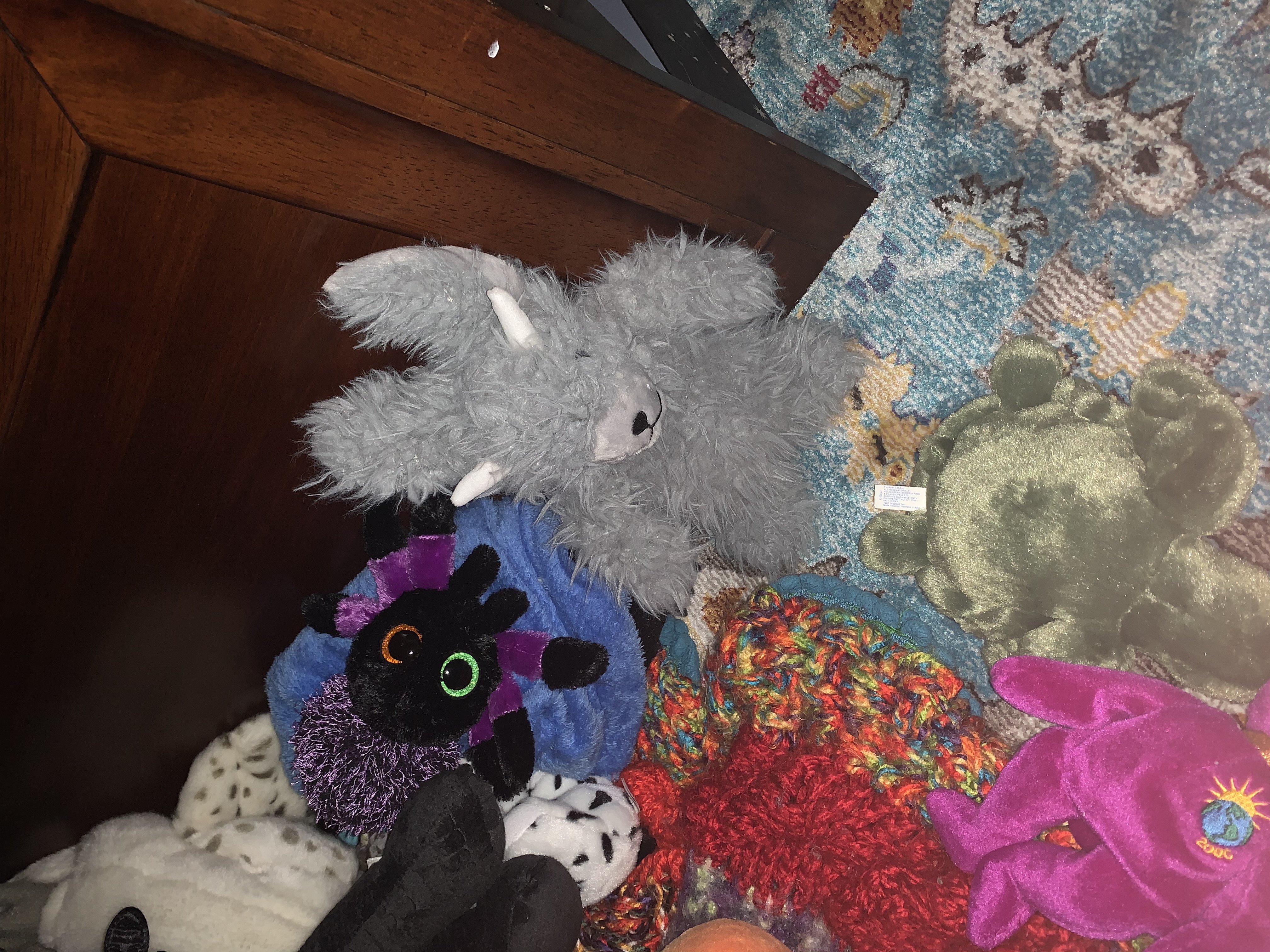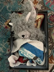 Moony has quick become a favorite stuffed animal for Trent. Like the book and the instructions, Trent made a bed for him that he goes in during the day, and then at night he takes him out and puts him at the end of his bed to stand guard.