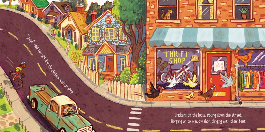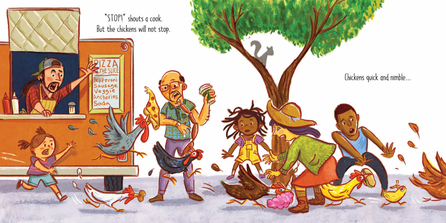 “Urban backyard chickens go on a madcap tour of the city in this rhyming romp. . . the narrative bounces off the tongue. The marker-bright illustrations are frenetic and filled with humorous details.” ~ Kirkus Reviews