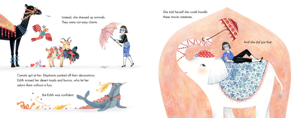 Review: As a fan of old Hollywood, I recognized Edith Head’s costumes right away. I mean–Grace Kelly in Rear Window, Audrey Hepburn in Breakfast at Tiffany’s, Tippi Hedren in The Birds, Fred Astaire in Holiday Inn, Elvis Presley in Blue Hawaii–anyone?!? And this is just the tip of the iceberg of Head’s designing. She was nominated for an Academy Award THIRTY FIVE times and won EIGHT making her the most awarded woman in the Academy’s history. But yet, she was behind the scenes and not as well known as the actors in front of the camera, so I am so happy to have this picture book biography to bring to light her genius. A self-taught young woman with no experience fighting her way up to being an Oscar winner–yes, please! Harvey does a fantastic job of sharing Edith’s magic from her childhood dreams to her adult reality and Toledano’s illustrations work perfectly for Edith’s style and costumes.
