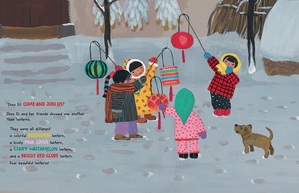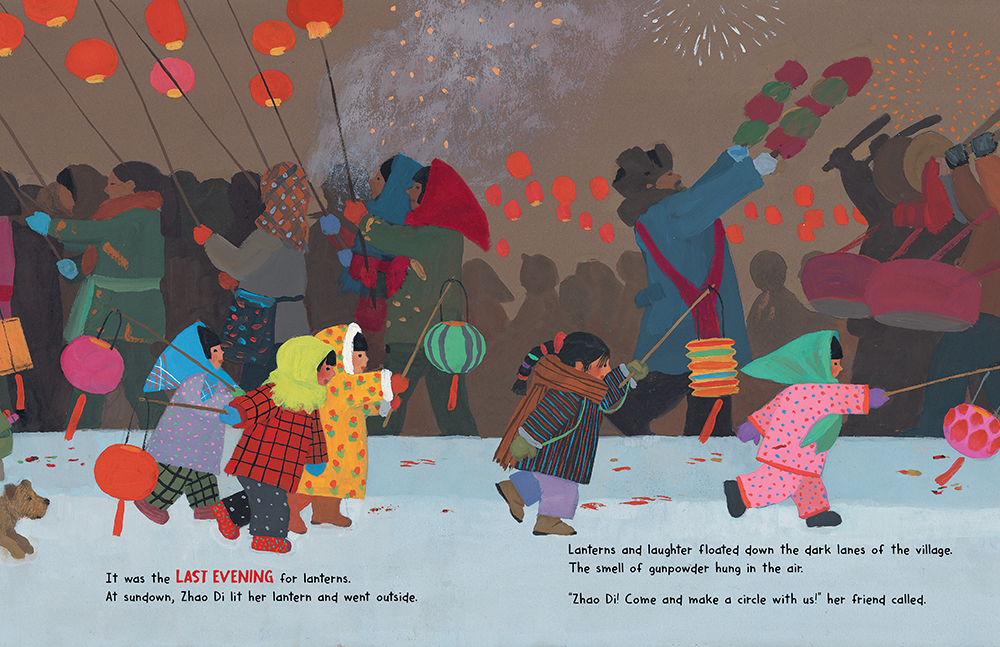 Zhao Di and her friends are excited to go out at night with their paper lanterns and celebrate Chinese New Year. Each holding a unique colorful lantern with a lit candle inside, they admire the breathtaking colors while doing their best to avoid the wind and the sneaky boys in the village. Every night, until the fifteenth day of New Year, Zhao Di and her friends take part in this fun tradition, experiencing the thrill of nighttime in their village. And then—it’s time to smash the lanterns!