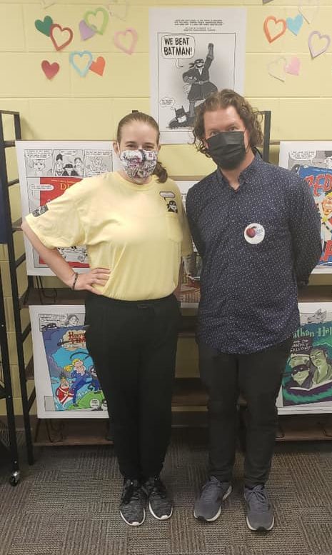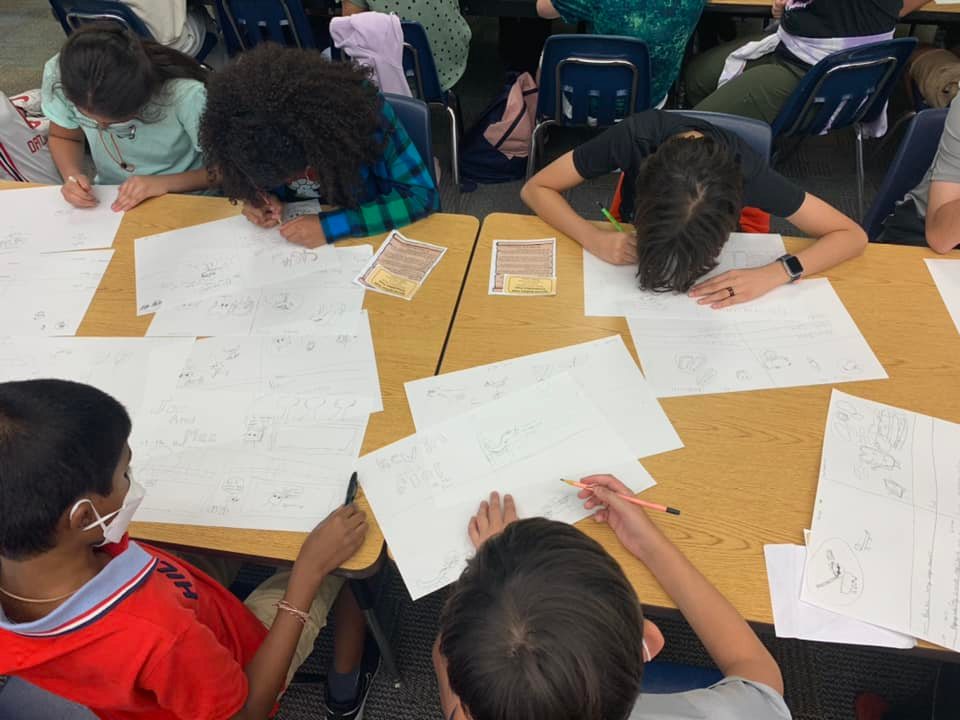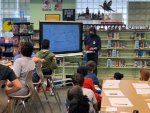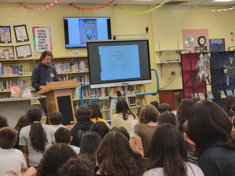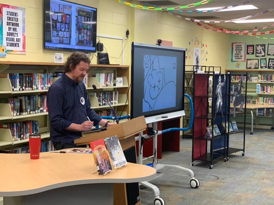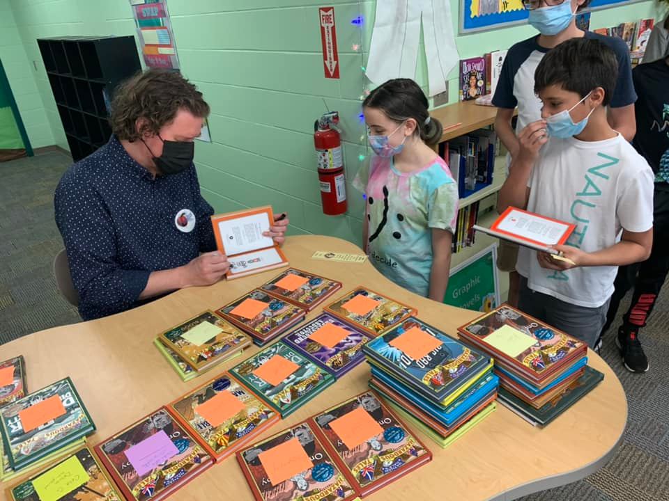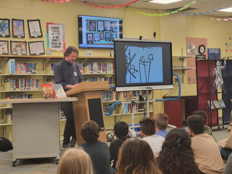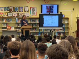 For his visit, he did 5 large group presentations where he told two different stories (one about James Garfield and one about Lewis & Clark) then a lunch writing workshop (where students wrote their own comic). Students greatly enjoyed their time with Nathan Hale!