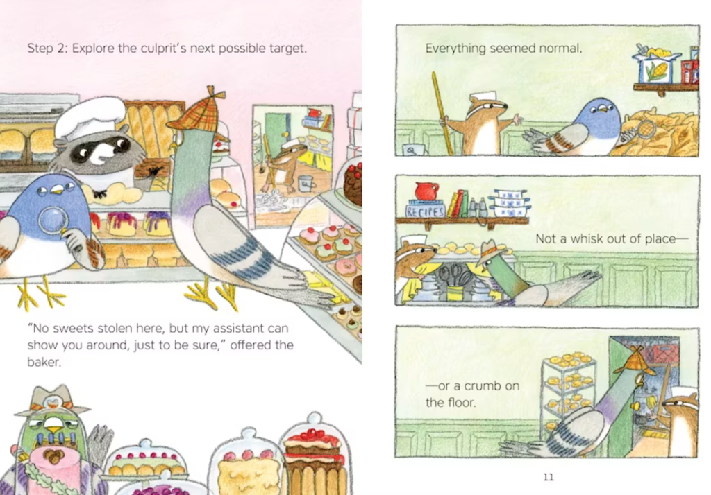 Tools for Navigation: The mystery of this text lends itself directly to predicting. Readers can look at clues and make guesses right along side the Pigeon Private Detectives! Also, the book takes the reader through 6 steps of an investigation which could lead directly to activities and could even be compared to the scientific method. OH! And with so much baking in the book–a baking cross-curricular activity would fit right in.