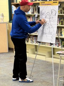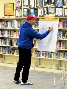 - My favorite moment from the author’s visit was seeing his drawing skills live and seeing the Raina Telgemeier books in his presentation. I was surprised to learn that he was inspired by Raina Telgemeier who is also one of my favorite authors.