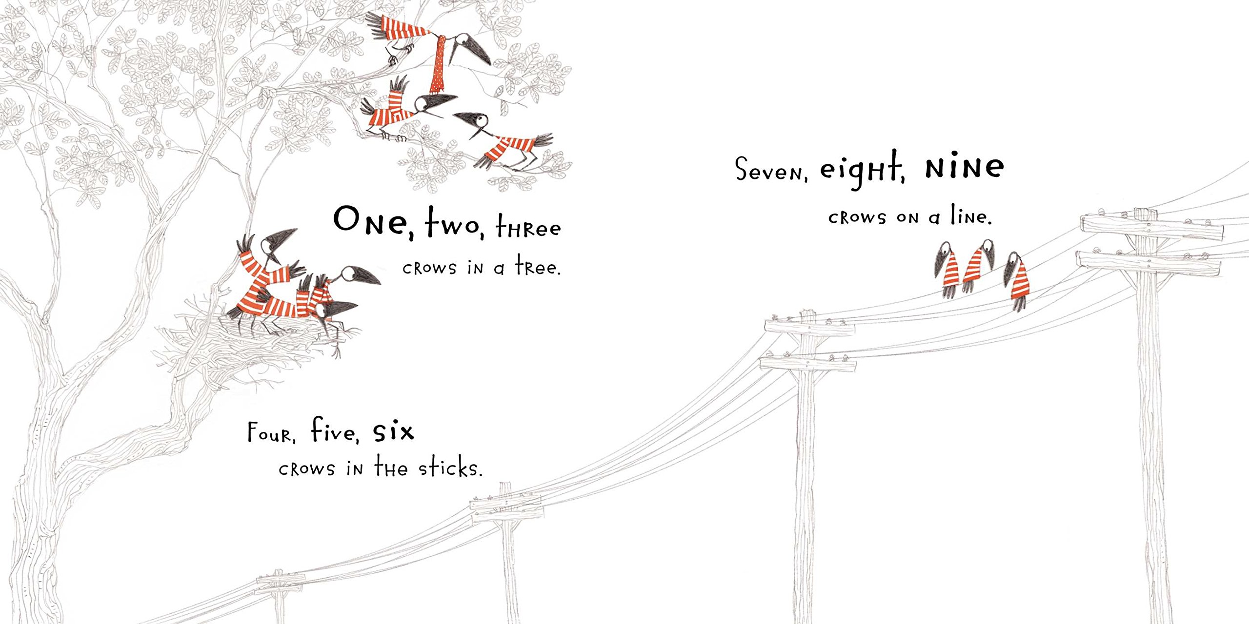 One, two, three, crows in a tree, bedecked in red scarves and hungry as can be. So they fly out of their nest with snacking in mind, and snack they do. Snack one, snack two, snack three—all the way to a dozen! But before they have time to complain about bellyaches, they have a bigger problem: a cat has been eyeing them…as potential snacks! Can these well-fed crows become well-FLED crows? Read and find out in this counting book from Newbery Finalist and two-time National Book Award Nominee Kathi Appelt, with spot-on illustrations from Rob Dunlavey. It’s the cat’s meow!
