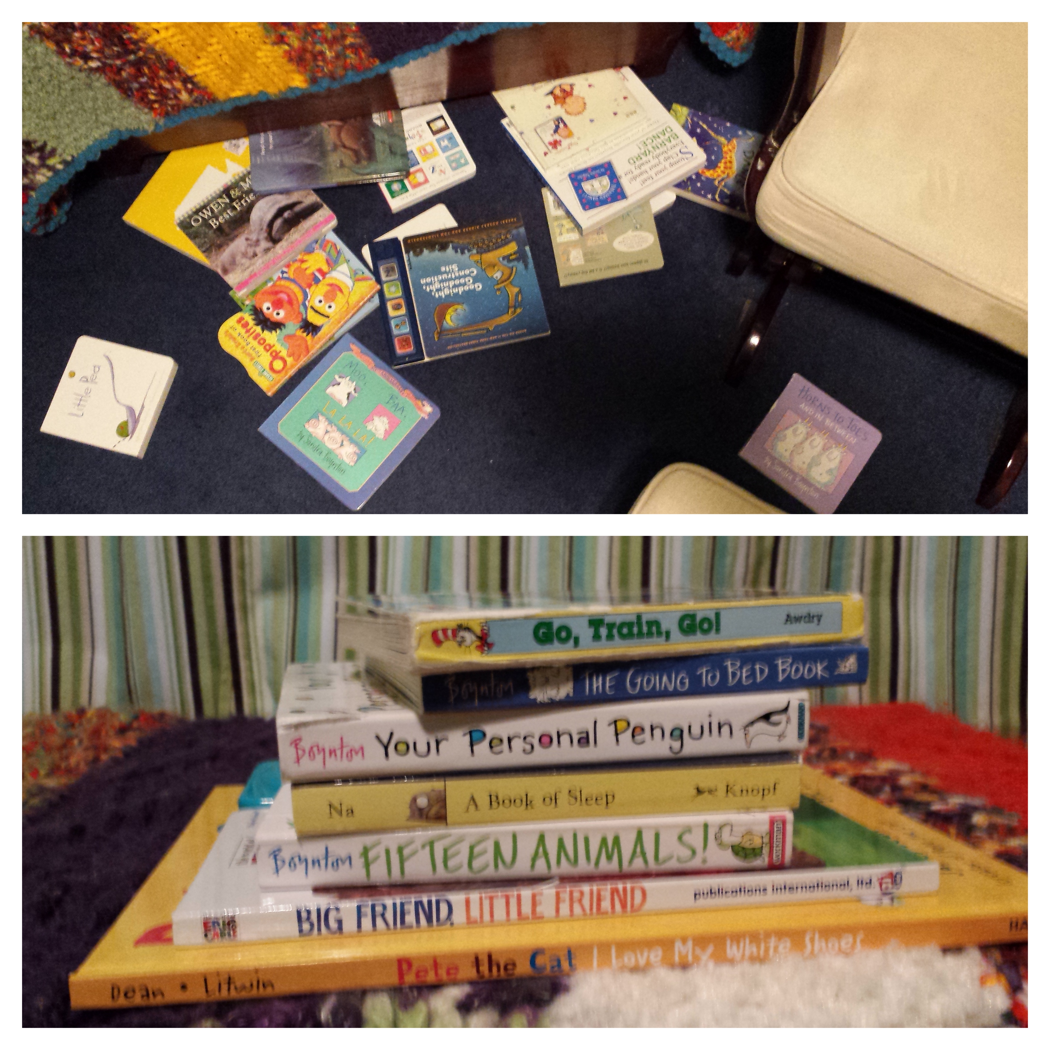 With Trent, I actually read 3 new books with him this week! First, we read Thumper’s Furry Friends, a Disney book about Thumper from Bambi. Trent loves touch and feel books and books with holes in the cover that make it easy to open, so this was a win-win for him. We also read Sophie’s Busy Day, a DK book about Sophie la girafe which was also touch and feel. Finally, I read The Monster at the End of this Book by Jon Stone, which is, I think, a favorite of so many people! Jim had read this to Trent before, but this was my first time. I’d forgotten how wonderful this story was! Though I really do wish I had a good Grover voice….. Next to these three books, it is usually the same thing every night (though he has discovered his bookshelf instead of just picking up books off the floor, so I hope this gives us some variety in the future).