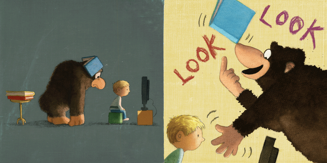 Everyone needs a little attention from time to time. Just ask our gorilla who will stop at nothing to be noticed by the boy with his eyes glued to the TV set. But for the gorilla, it’s going to take more than a quiet nudge to steal away the boy’s attention. When his usual antics fail to catch the boy’s eye—LOOK OUT! The gorilla has some other tricks up his sleeve.