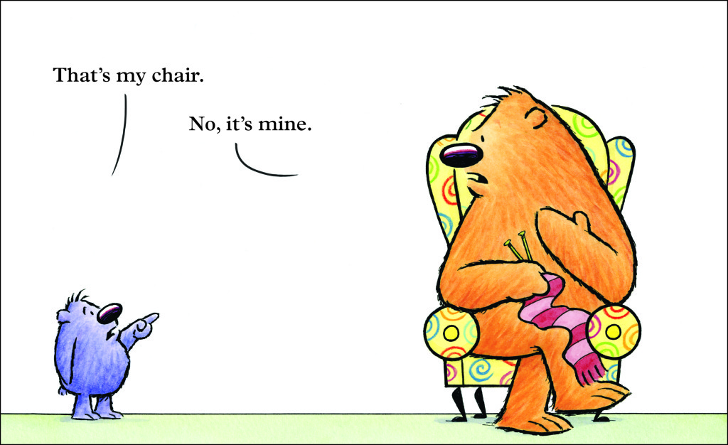 Goodreads Summary: Two fuzzy creatures both want to sit in the same comfy chair. The trouble is, they can’t agree who it belongs to. They get madder and madder, until…