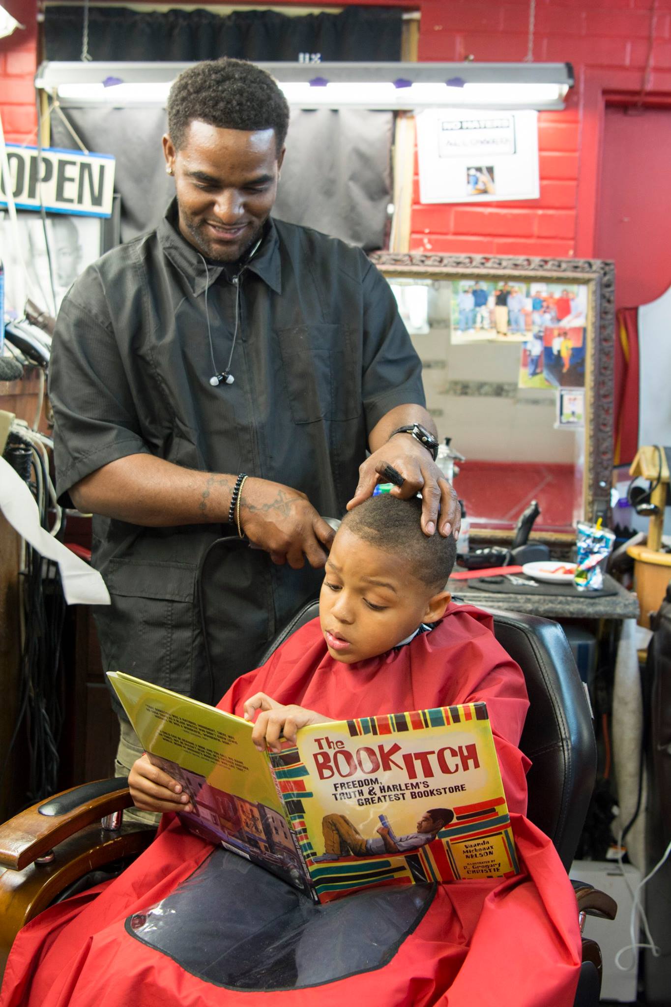 Line 4 Line takes place once a month, and O’Neil and his other barbers come in and volunteer to cut hair of boys ages 2-13 years for a few hours. I have my helpers who work for NAP assist. We set up books in the barber shop — books from my collection which are either art or Black focused, or classics of all different levels — and kids come in, and I find out their grade, assess their reading level, and help them pick a book. They then read the book to me or one of my helpers with the barber assisting and encouraging while getting hair cut.