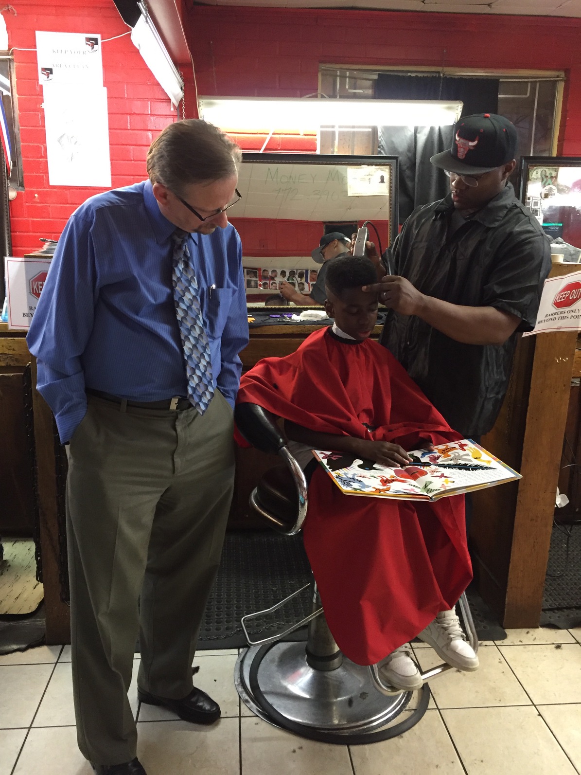 For very young readers, we have had younger but strong readers do the reading, or I will work one on one to help them decode and sound out words. As the program is still very new I see lots of ways to adapt, and ways to track progress for repeat kids, and I want to set up an in-house library for all ages in the barbershop and maybe a reading list. There is much to be done to expand this program including book groups or short topics discussions and maybe even mentoring/tutoring — right now we also do art projects with the kids who are waiting for haircuts and at the end of the evening they can go take books home from the Free Little Library.