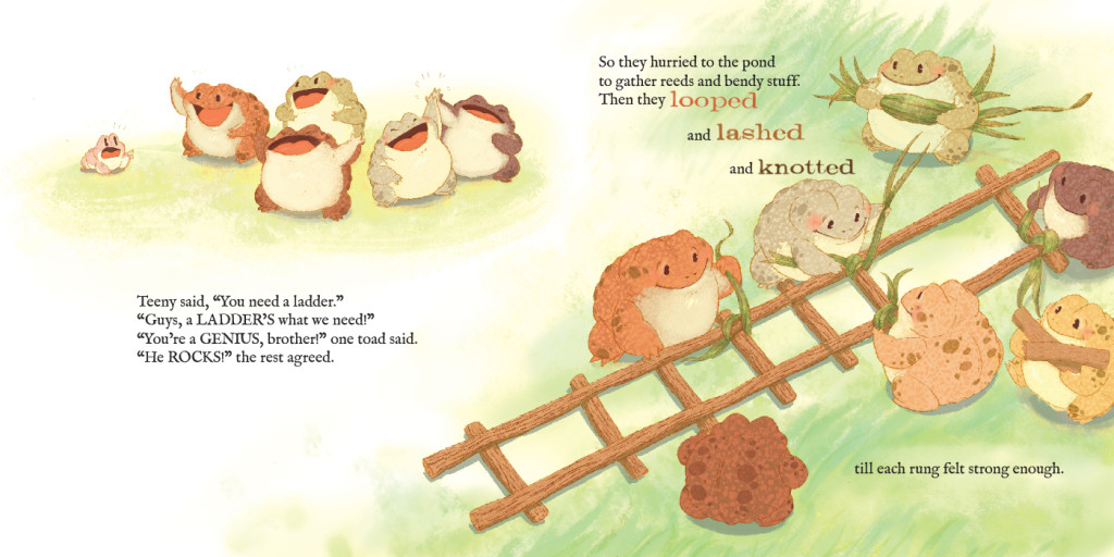 Ricki’s Review: I should be honest that frogs and toads are my favorite animal. I love everything about them! Reading this book was such a joy. I loved how the words danced across the page. If you look at the image below, you will see the way the words pop. The toads are personified in a way that makes me smile. They high five, cheer, hold each other up, etc. Teeny may be little, but she is fierce. It takes her some time to realize that she has valuable ideas. I enjoy teaching my son to be critical of gender as we read this book, and I particularly enjoyed the feminist theme.