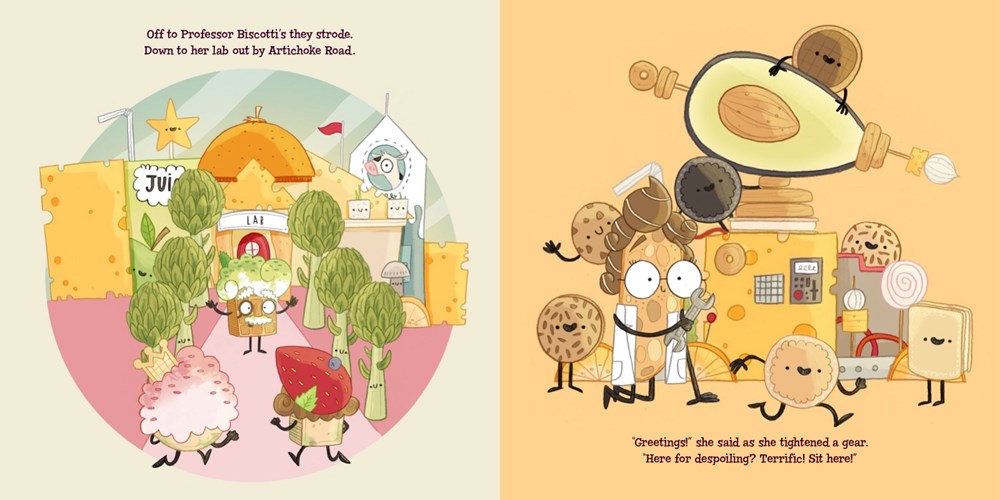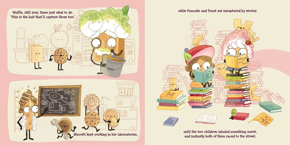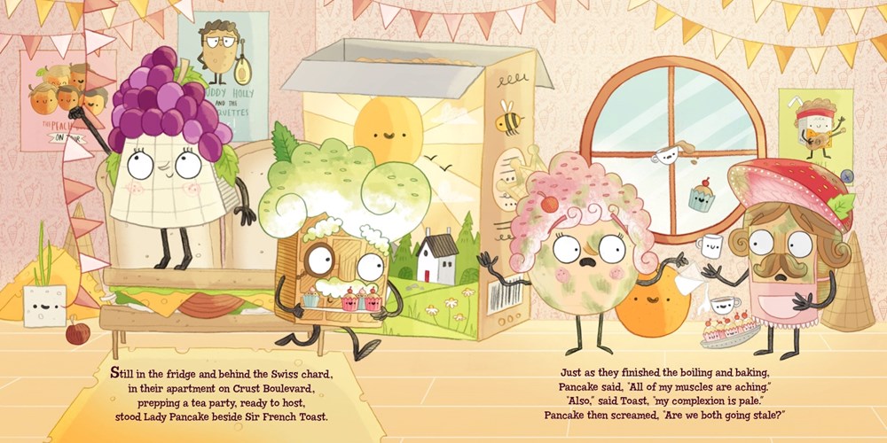 Lady Pancake is aching; Sir French Toast’s looking pale. Could they be going . . . STALE? Maybe a visit to Professor Biscotti’s lab for her despoiling procedure will help. But instead of beautifying them, Biscotti accidentally transforms the two treats into toddlers! Frightened of the now gargantuan (to them) Baron von Waffle, the mini breakfast foods scamper off on an adventure in the fridge, visiting everywhere from the Bran Canyon to Limes Square. Will Baron von Waffle and Professor Biscotti figure out a way to turn them back into a grown Lady and Sir? Or will they stay short & sweet forever?