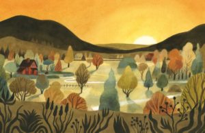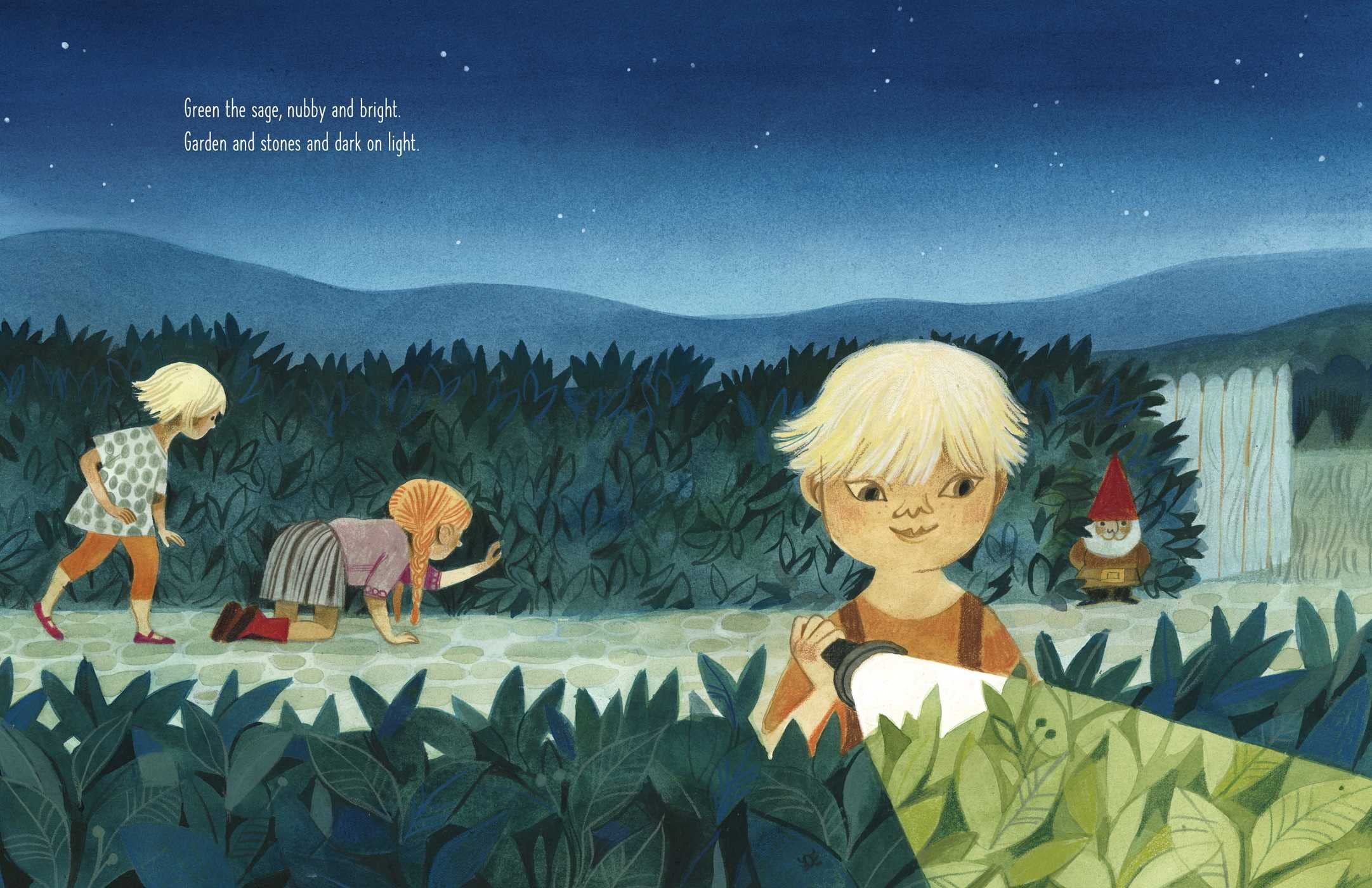 “A bedtime chant capable of transforming anyone into a night owl. Sumptuous watercolor, gouache, and colored pencil illustrations show a day shifting from sunshine to twilight to a deepening night sky. Meanwhile, three children are pulling on their boots, grabbing their flashlights, and heading out into a nighttime world as alive as it is welcoming. As the children search and explore, the text repeats the words dark on light through mesmeric rhymes. “Orange the moon, burnished and bright. / Meadow and owl and dark on light.” At last the children peek into a burrow and find their dog, the object of their search. The nighttime is welcoming here, and the children return home to the cozy arms of their parents. Truly the entire enterprise feels similar in tone to Janice May Udry’s Moon Jumpers (1959), illustrated by Maurice Sendak, as when the children ramble through fields of fragrant lavender beneath a brilliant sky. This is a book capable of banishing nighttime fears, showing the night to be a time of wonder, exploration, and even comfort. Sala’s art matches the cadences of the text beat for beat, offering consistently beautiful images of this undiscovered nighttime world…. Lilting, haunting, rhyming, and as unforgettable as a dream the daylight just can’t quite erase.” – Kirkus Reviews, *STARRED REVIEW*, 9/15/2022