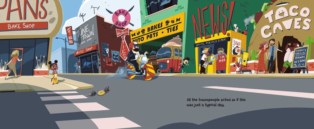 Henry: On the final page, page 20, in the corner, near Pam’s Bake Shop, the rats are finally eating the donut. Haha! It’s cute. There’s a dog on top, too!