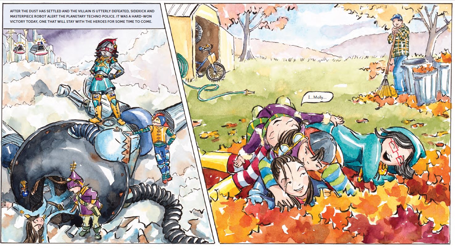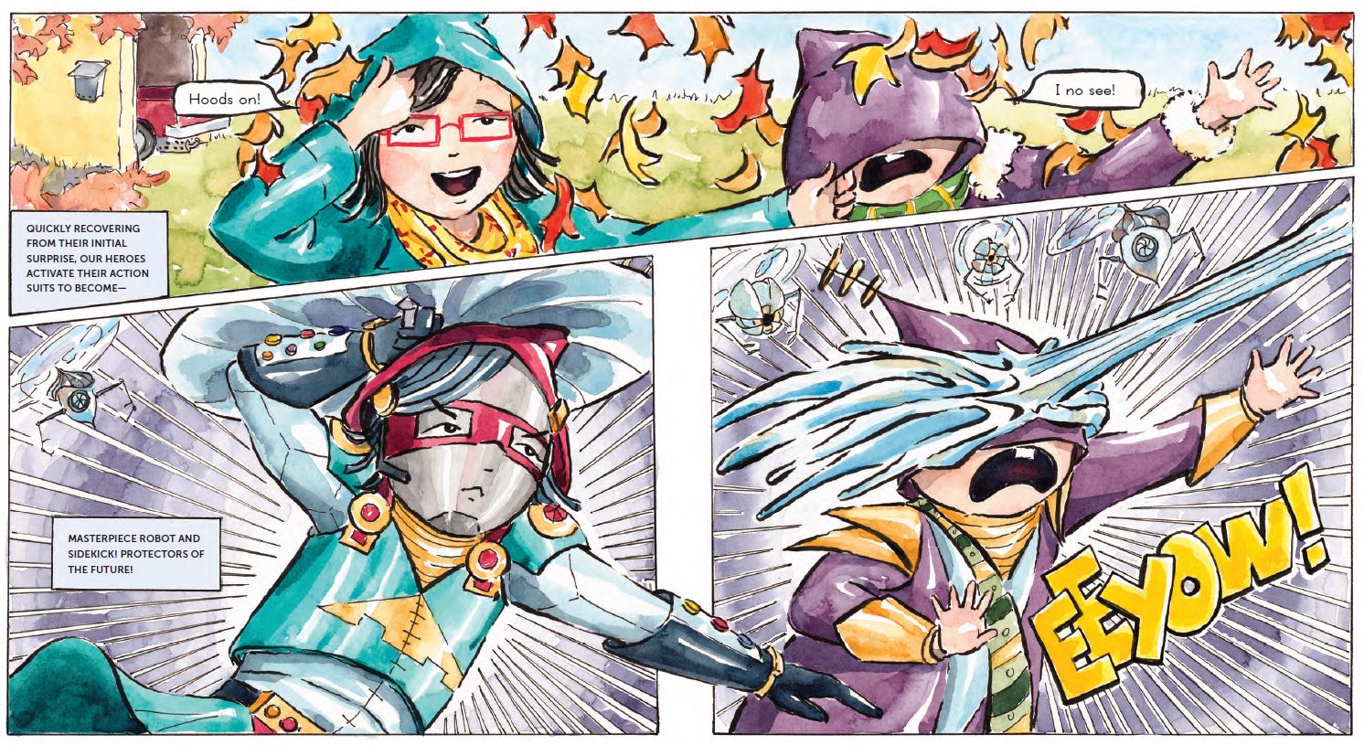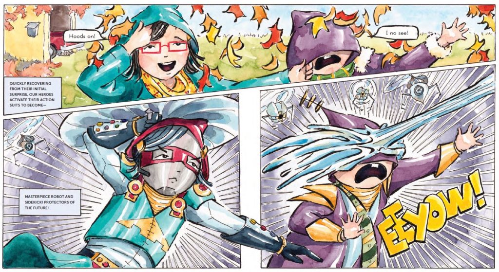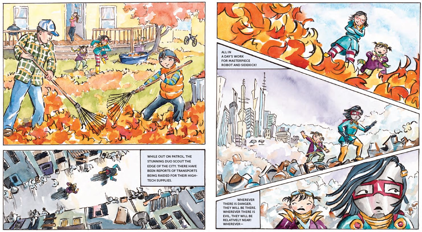 This one is such a fun read, and one kids will definitely relate to! It also lets adults relive those childhood memories where ordinary things – such as a pile of leaves, or a large cardboard box – can turn extraordinary with just a bit of imagination. The transitions back and forth from suburbia to dystopia in this story within a story are deftly rendered with contrasting palettes. The rollicking interactions of the sibling heroes and villains make Masterpiece Robot pure fun to read.