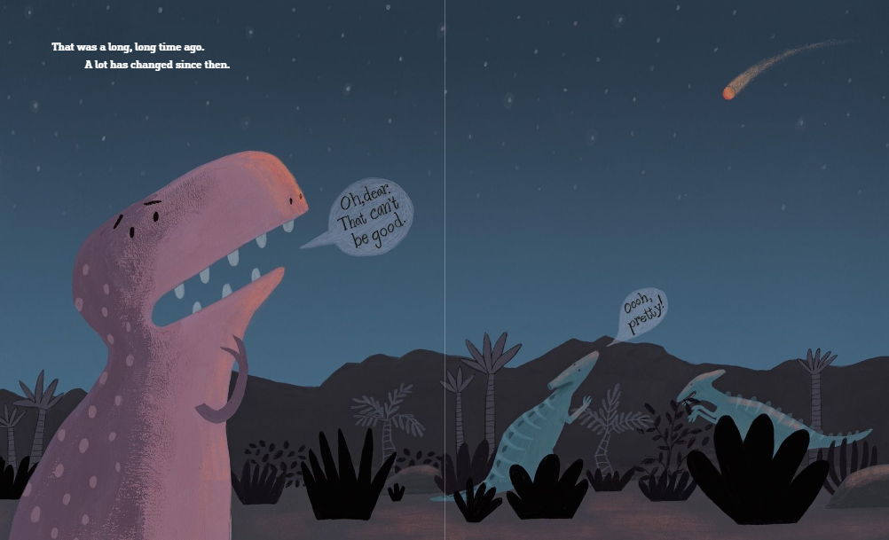 Review: Deb Pilutti, like she did in Old Rock, does a great job giving voice to things that may not usually be heard. I think we often hear from dinosaurs living in their own time, but not often do we hear from a dinosaur from the past; this is how the creator takes her book to the next level–this isn’t just another dino book! She also is great at creating really entertaining picture books with a scientific element, and although the messages of the book are clear, she does this without turning the book into a didactic narrative. Another really fun read by Deb Pilutti!