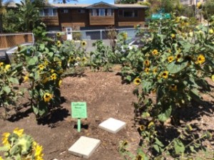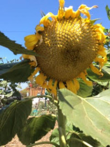 Winter rains in drought-stricken Southern California were sparse, but with dripping irrigation a few times a week, soon the sunflowers were sprouting. We measured them week by week, watching them grow higher and higher. Soon they were as high as a first grader’s head. Finally they were higher than my own head and shooting out buds.